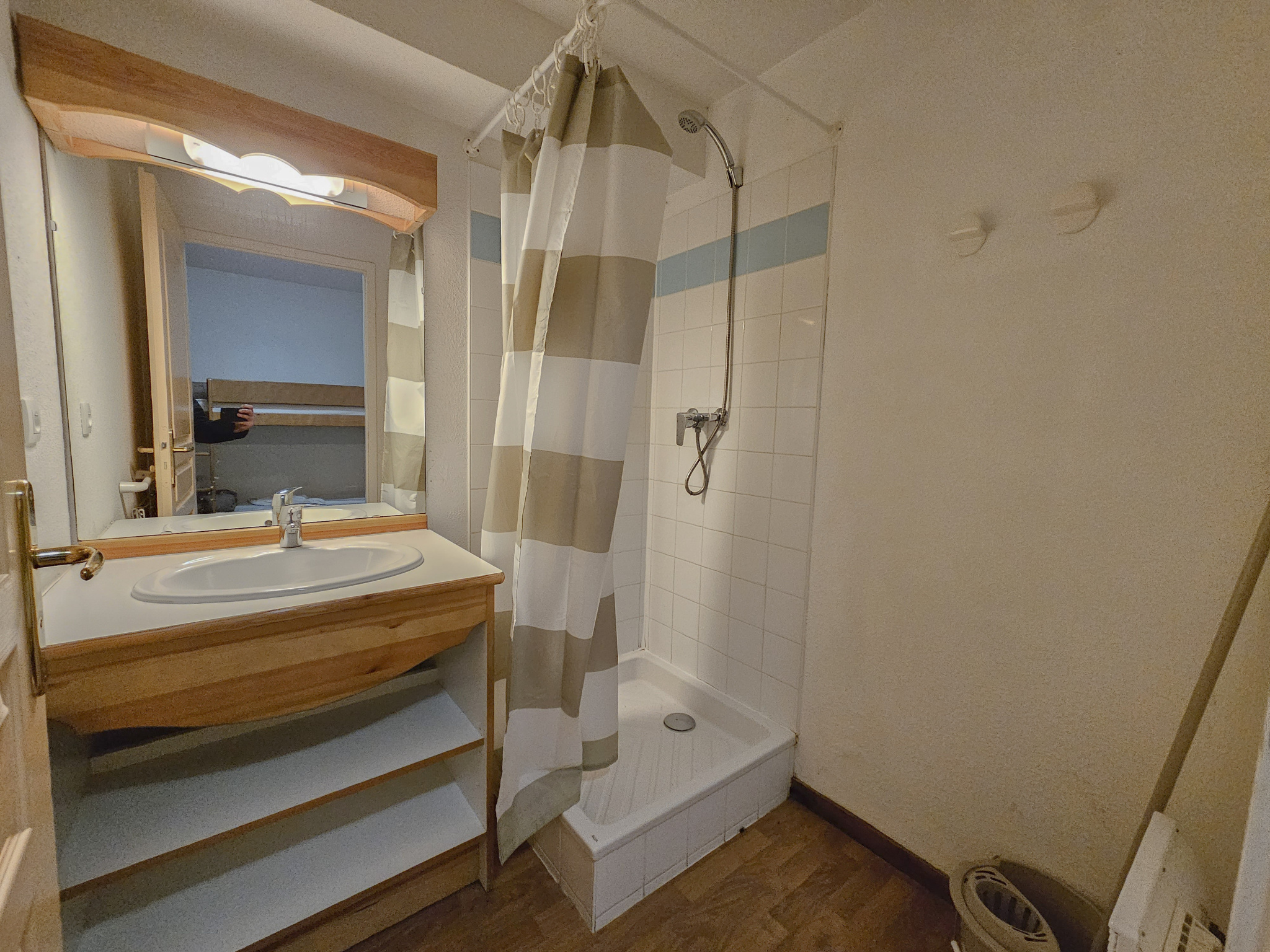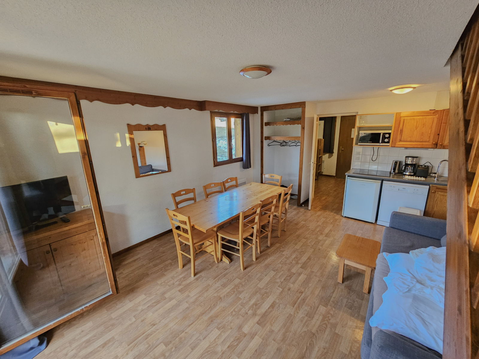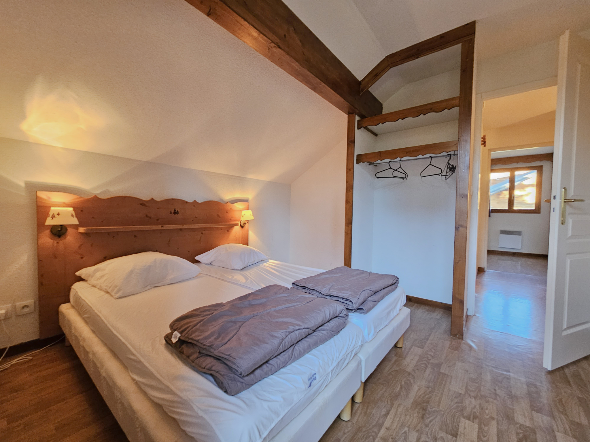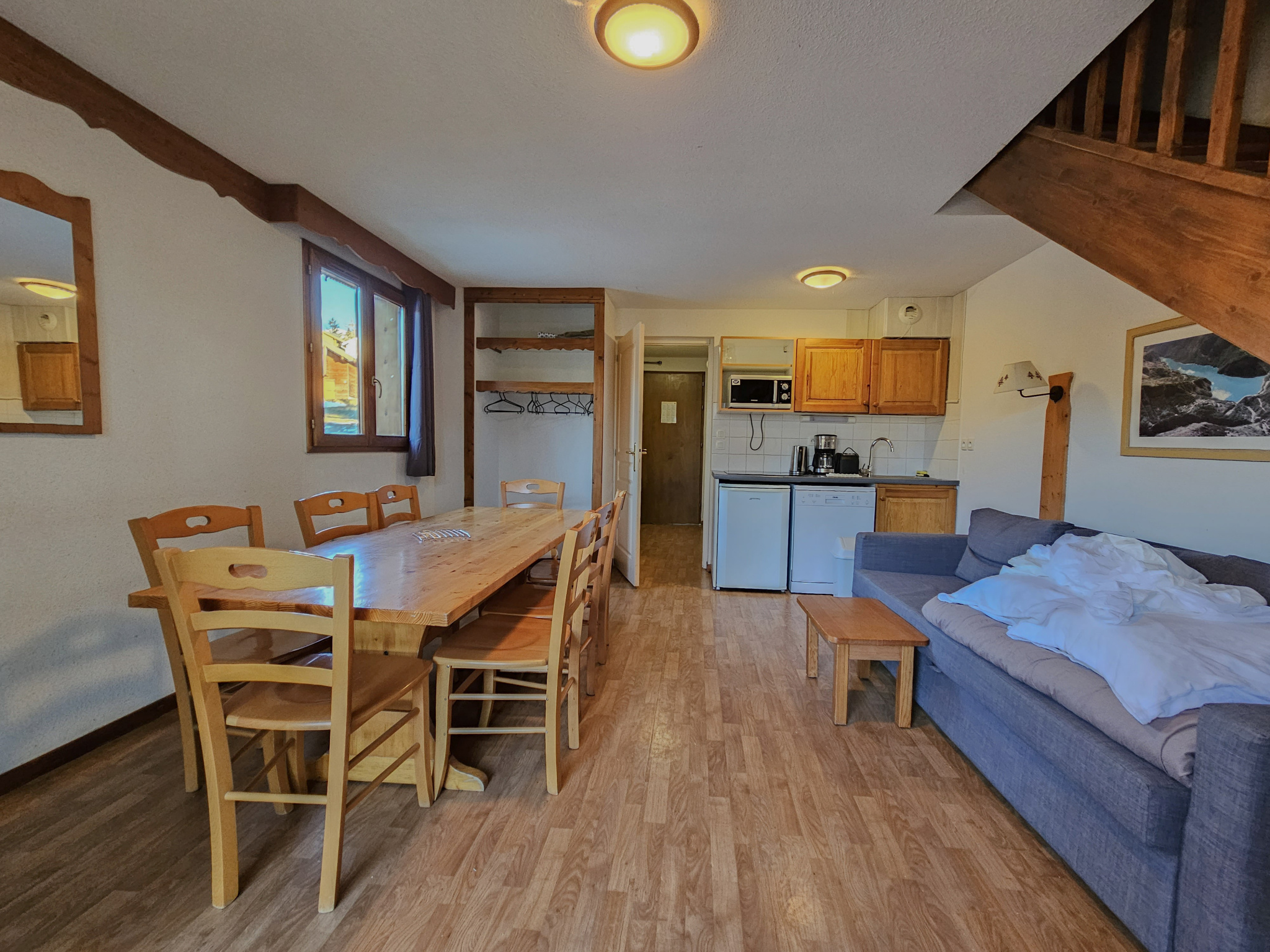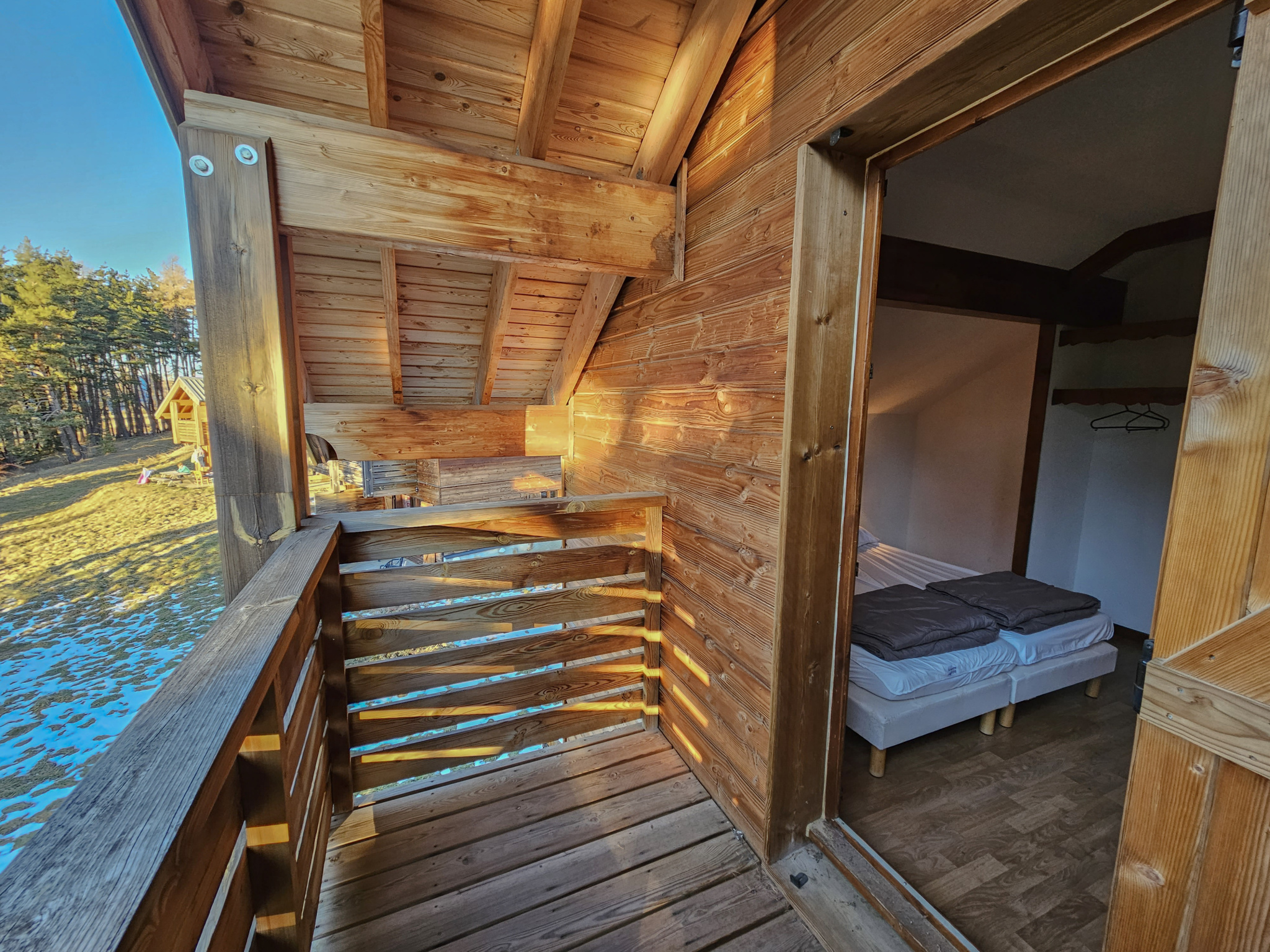 Sur 2 niveaux, ce chalet propose un dégagement avec coin montagne, salle d'eau, xc, Grand salon-séjour-kichenette ouvrant sur terrase extérieure et nature !!