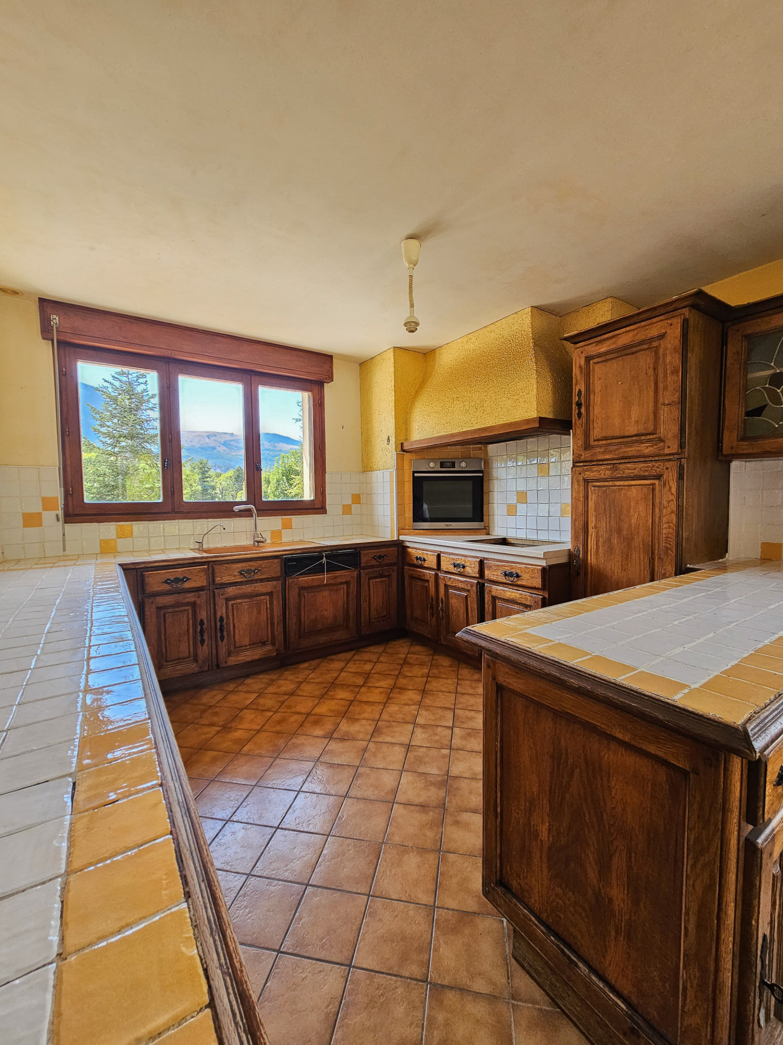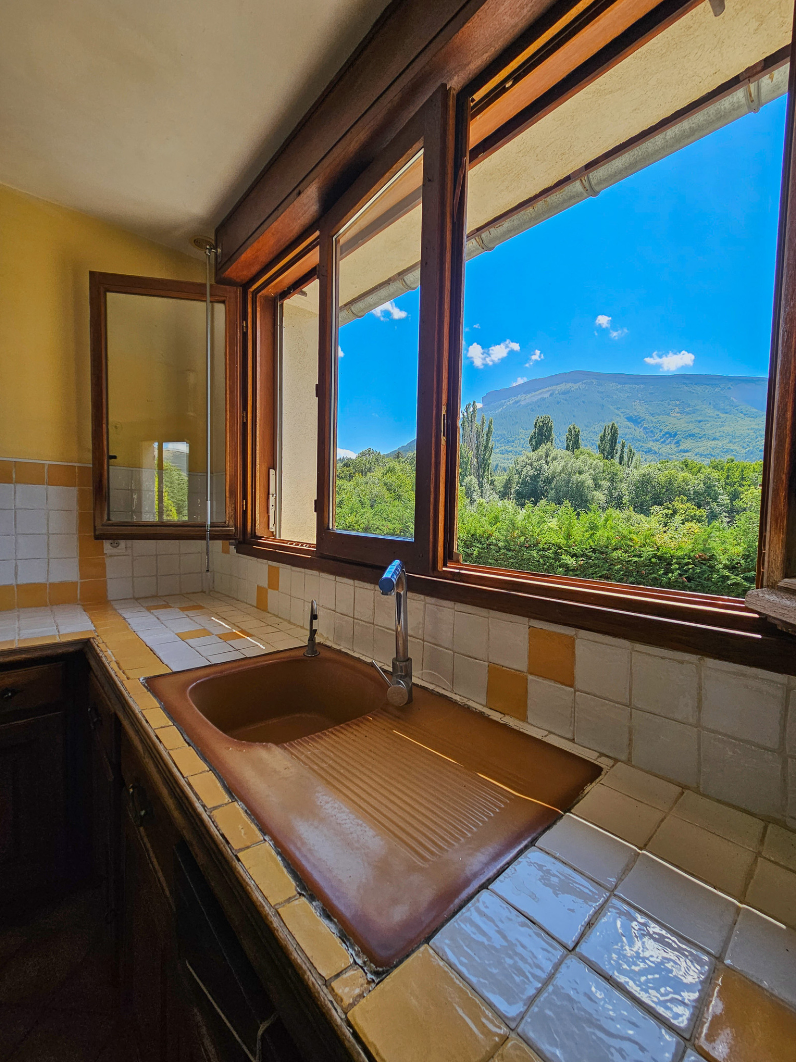 En rez de jardin, une grande cuisine équipée face au Devoluy, une grande pièce de vie de + de 65 m² avec cheminée, une chambre, salle de bain et WC.