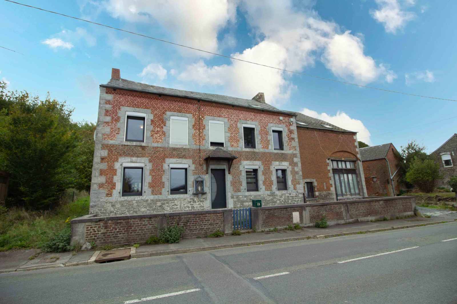 Le 1er bâtiment avec une belle façade en pierres et briques est le logement familial avec 10 chambres pour une superficie de +/-180m²